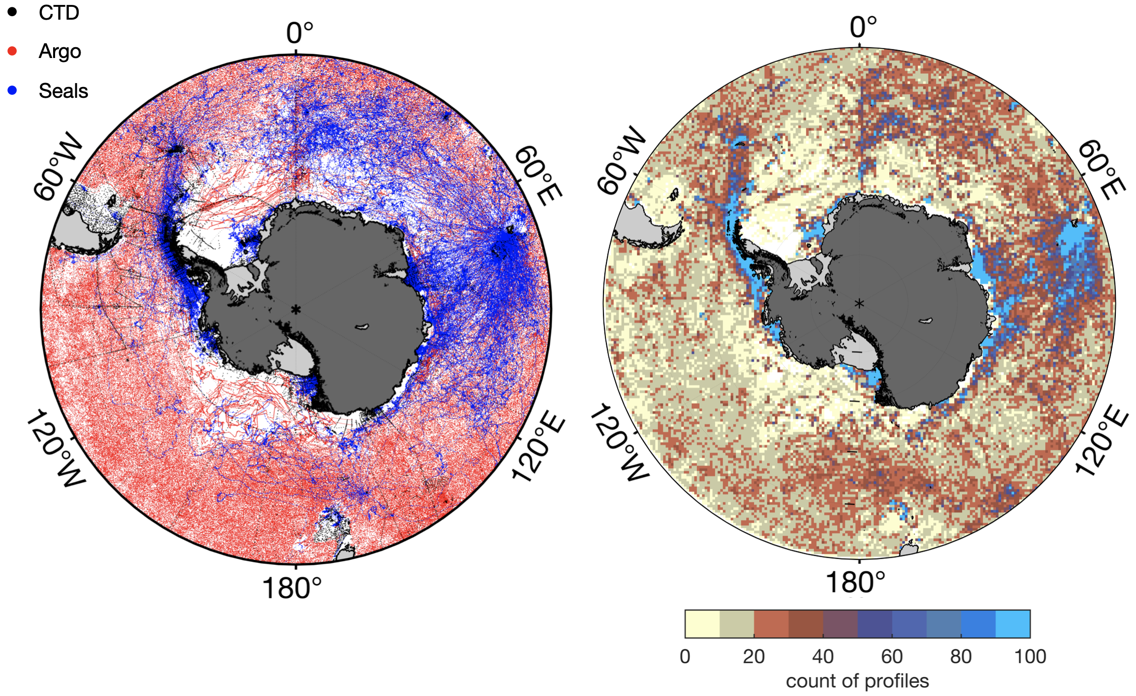 Temperature/Salinity profiles distribution south of 45°S and the count numbers in 50km bins