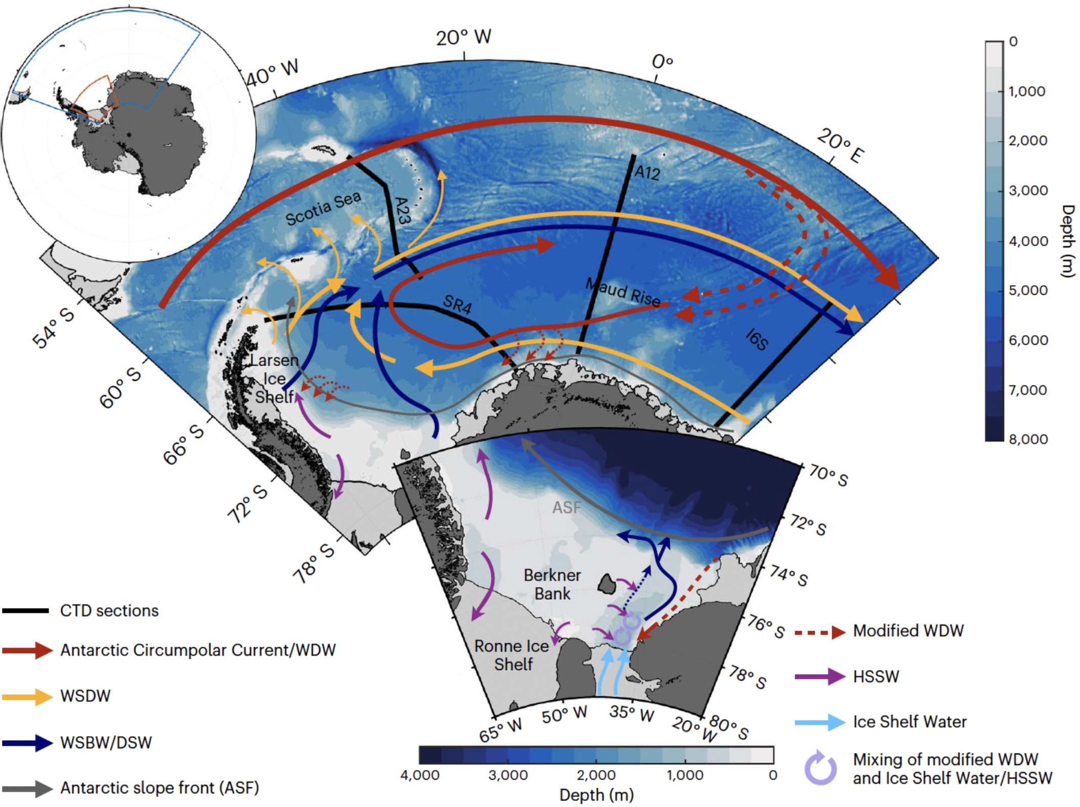 Over the past 30+ years, ship observations shows a decline of Weddell Sea Bottom Water volume - a precursor water mass for Weddell-origin AABW. The schematic below depicts the water mass circulation in Weddell Sea.